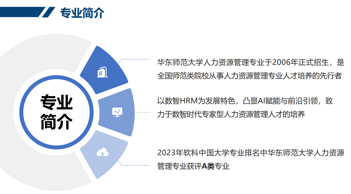 人力资源管理专业以“数智赋能+学科交融”为核心理念,以“场景驱动、行动学习、前沿引领”为导向,按照“通识教育与个性发展相结合,基础拓宽与实践强化相结合,思维养成与智能教育相结合”的培养思路,致力于培养具备政策分析与战略规划能力、产业认知与行业洞察能力、数智思维与技术运用能力、岗位胜任与业务实操能力、创新思维与学术研究能力的数智时代专家型人力资源管理人才。