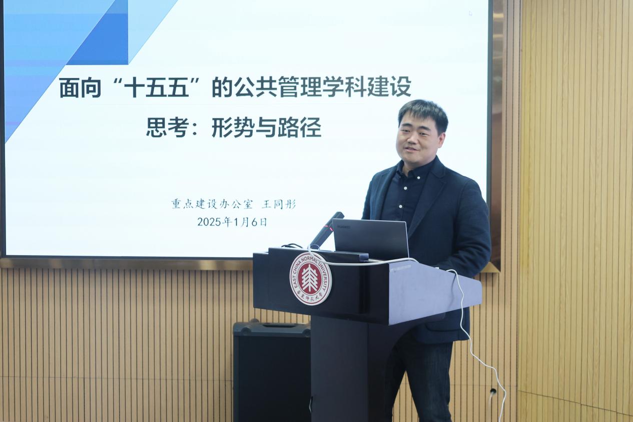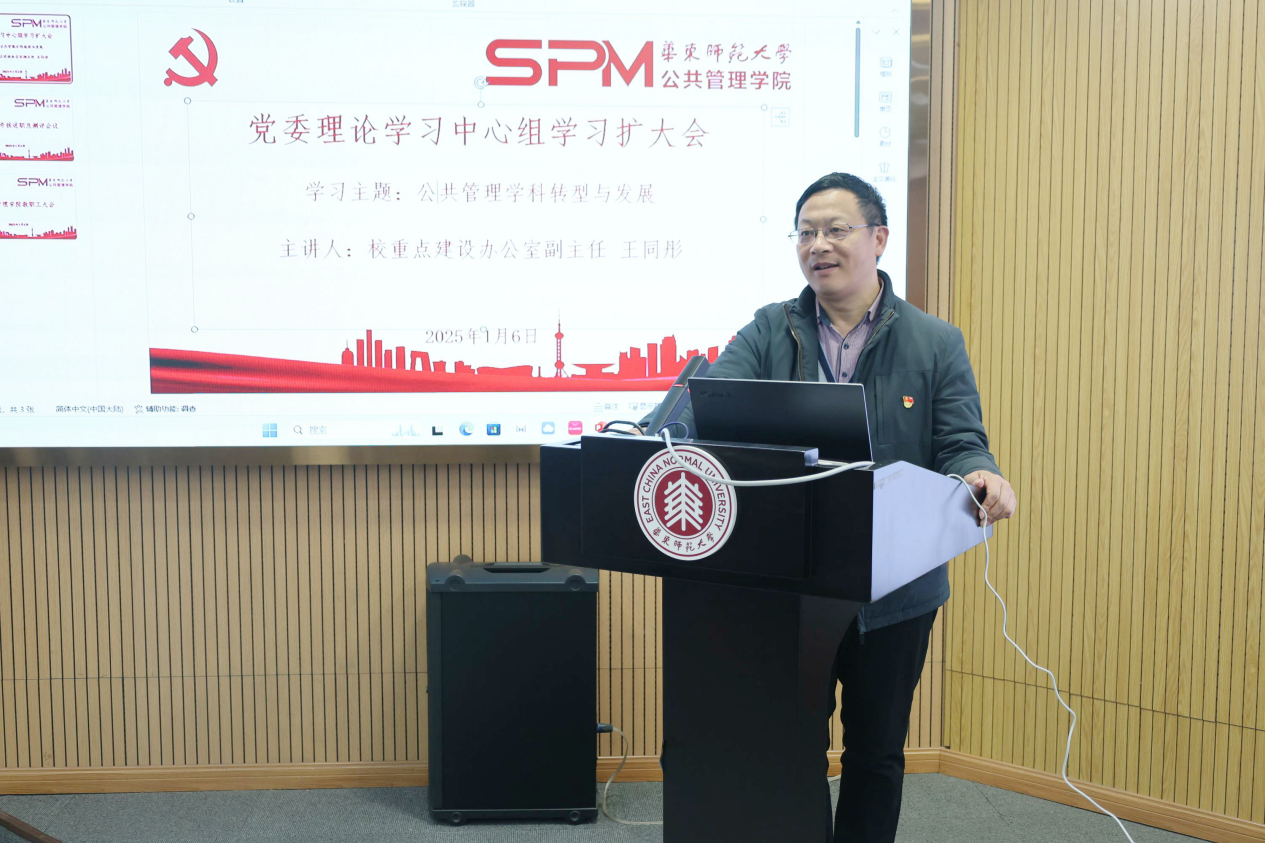 1月6日下午,吃瓜网站 党委在普陀校区图书馆二楼报告厅举行理论学习中心组扩大会,邀请校重点建设办副主任王同彤以“面向‘十五五’的公共管理学科建设思考:形势与路径”为题做报告。学院党政班子、全体教职工参加本次集体学习扩大会,会议由吃瓜网站 党委书记高恩新主持。
