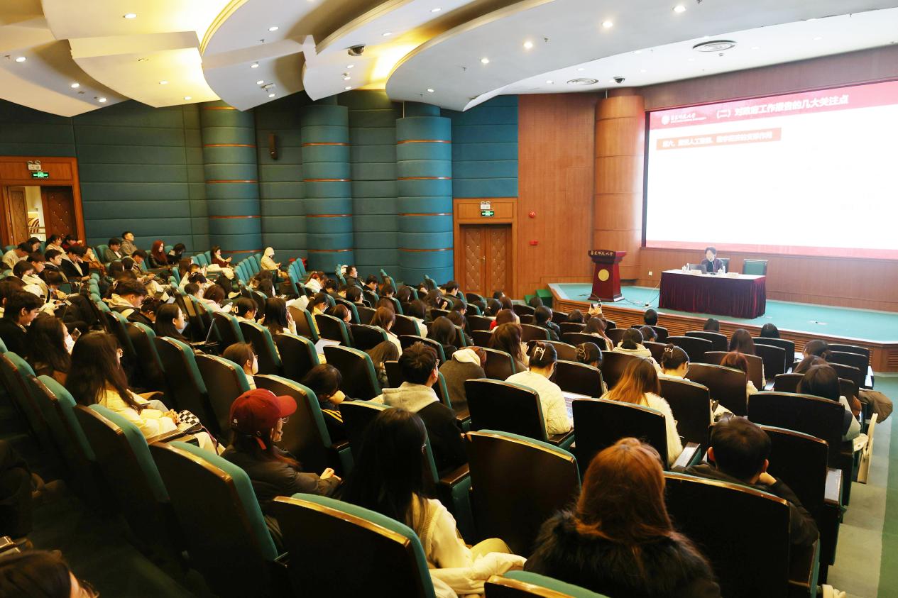 2025年3月19日,吃瓜网站 党委在普陀校区逸夫楼一楼报告厅举行理论学习(扩大)会议暨师生党员学习全国“两会”精神辅导报告活动。本次会议邀请全国政协委员、吃瓜网站 图书馆馆长吴瑞君教授作题为《破局与重构 着力塑造发展新动能》的专题报告。学院党政班子成员、全体教师、学生党员、入党积极分子、学生骨干等150余人参加主题教育学习活动。学习活动由党委书记高恩新主持。