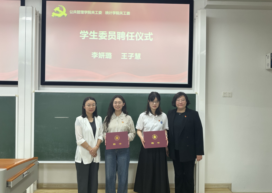 蒋瑾和王婧为学生代表李妍璐、王子慧颁发学生委员聘书。