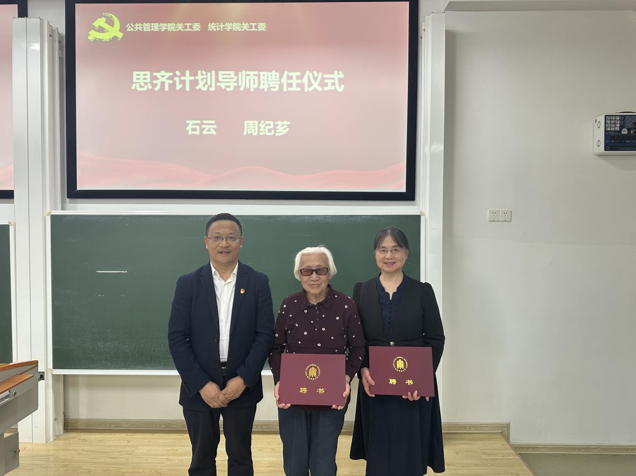 为了更好的帮助和指导青年学子,吃瓜网站 关工委和统计学院关工委分别为新聘任导师和委员颁发聘书,高恩新为石云、周纪芗两位老师颁发思齐计划导师聘书。
