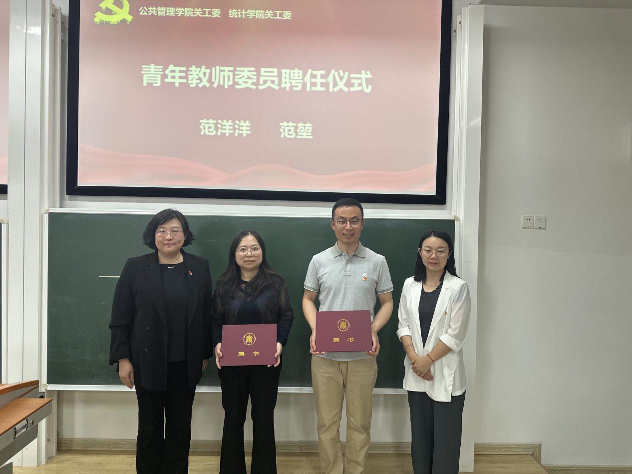 王婧和蒋瑾为青年教师代表范洋洋、范堃颁发青年教师委员聘书。